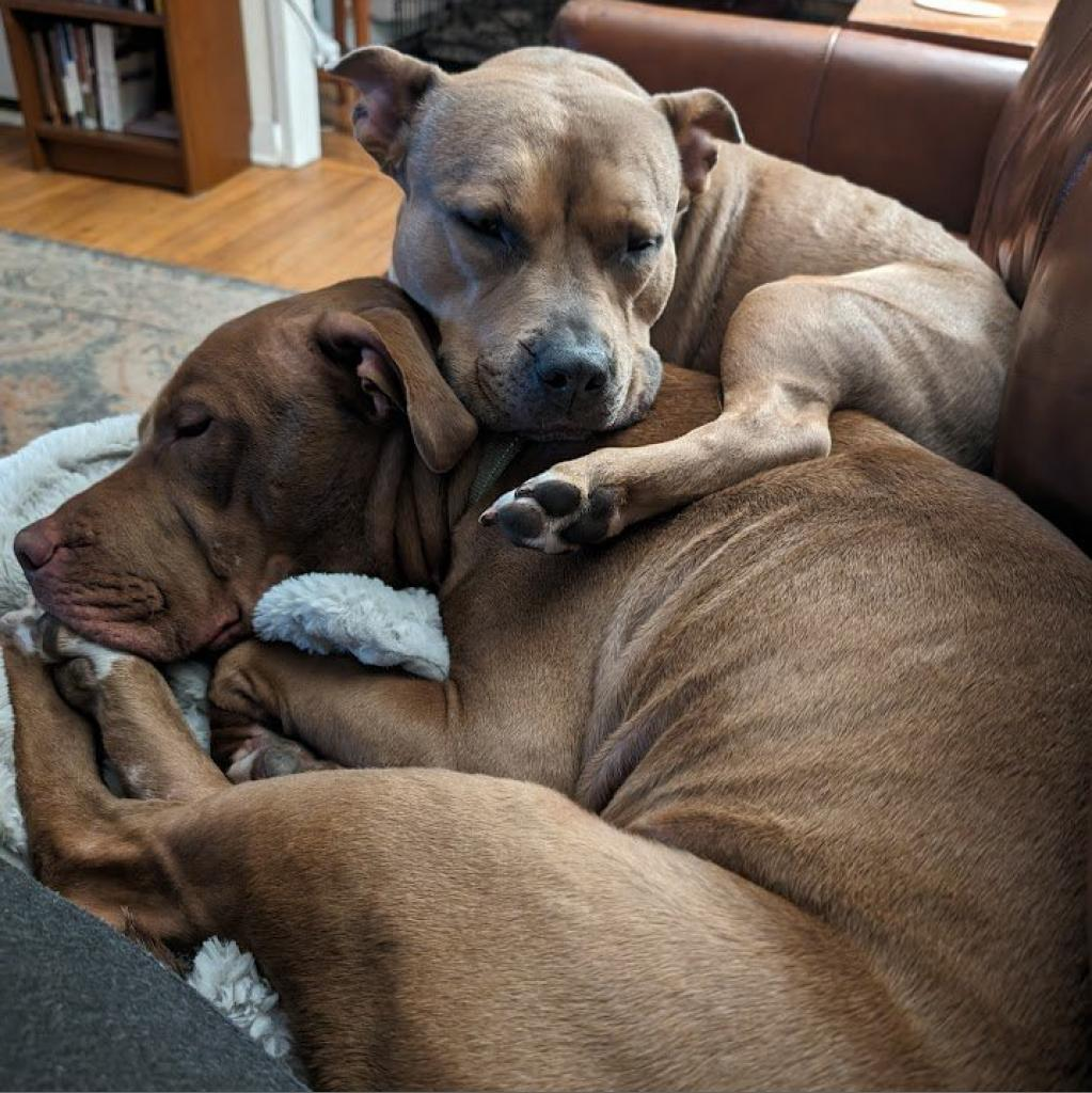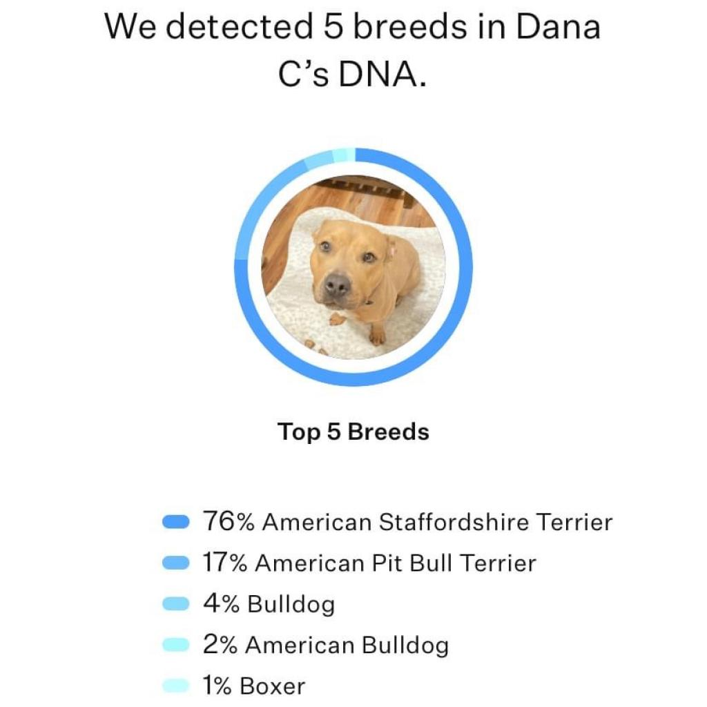 I’m an American Staffordshire mix (check out my DNA results in the photos!), spayed, and dog friendly. I’m great with hoomans and older kids too. I want to play with everyone and give all the smooches!