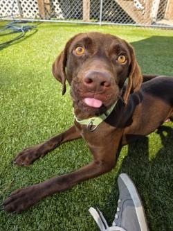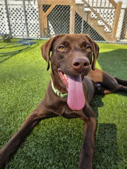 Got energy? Perfect-because Fella has A LOT of it! This 1-year-old chocolate Labrador is a zoomie champion, playgroup MVP, and an all-around good boy. He’s great with dogs, adores kids, and is looking for a forever family who can keep up with his fun-loving, roughhousing ways.