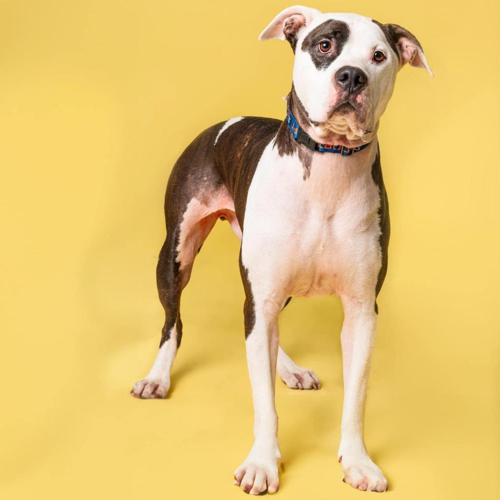 Murphy is the full package — handsome, easygoing, and steady as they come. With his big blocky head, soft eyes, and classic black and white coat, he turns heads everywhere he goes. But he’s not about drama — he’s about good walks, soft couches, and being a loyal friend.
